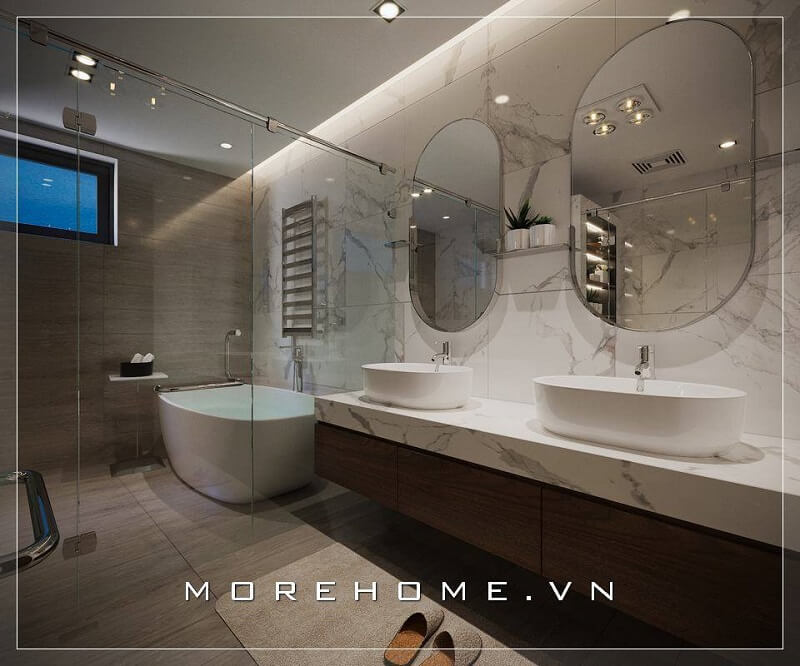 Thiết kế phòng tắm biệt thự, nhà phố sang trọng tinh tế với vách kính ngăn hiện đại và mẫu gương tròn độc đáo.