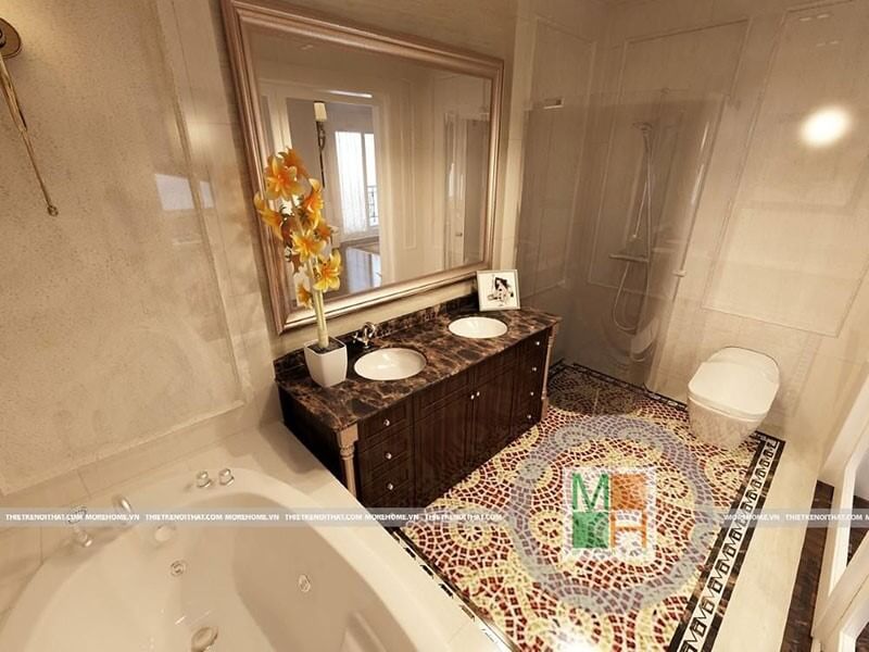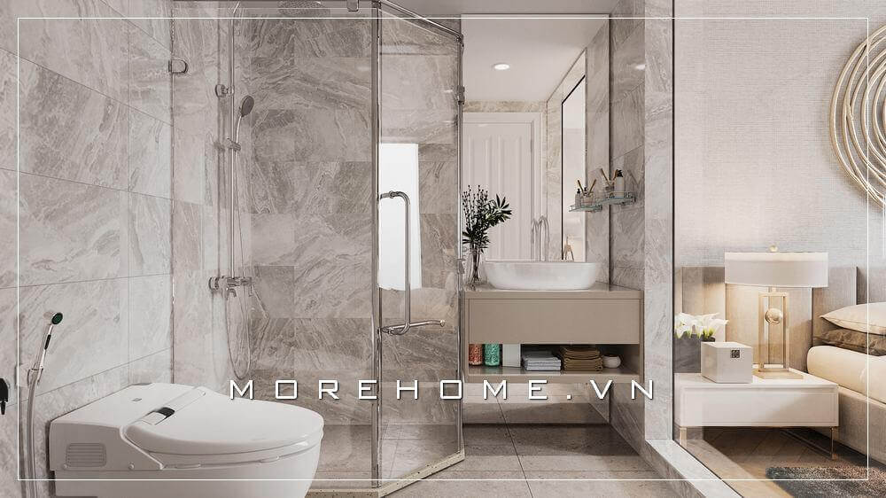 Với thiết kế gương phòng tắm và kính cường lực làm vách tắm kính giúp phòng tắm thoáng rộng hơn