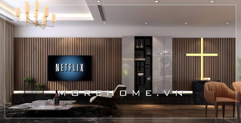 Thiết kế không gian nội thất phòng khách ấn tượng với chất liệu gỗ ốp tường trang trí.