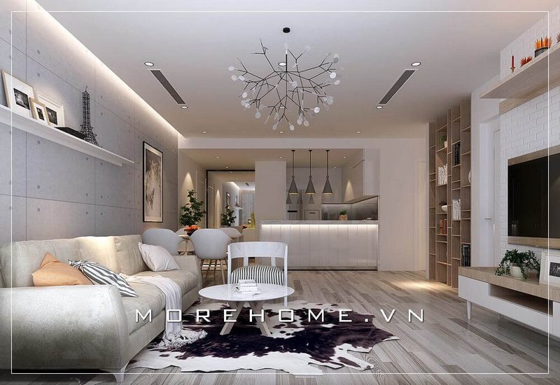 Không gian phòng khách căn hộ chung cư đầy ấn tượng từ bộ sofa khung gỗ óc chó cao cấp được thiết kế theo phong cách hiện đại kiểu dáng văng tiện nghi.