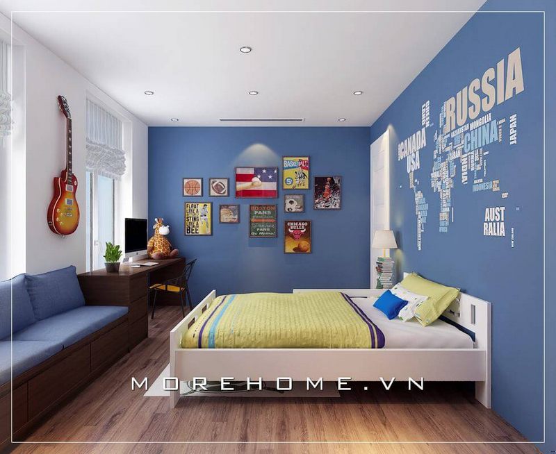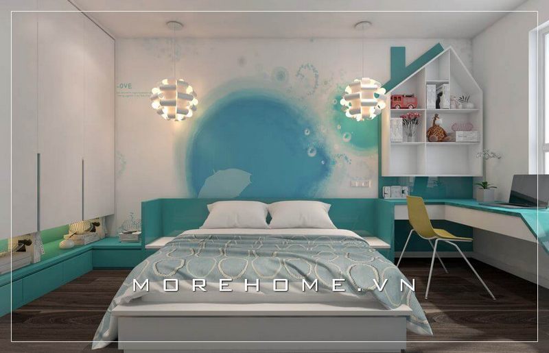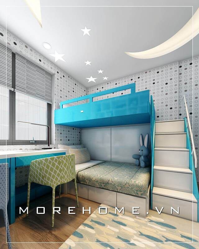 Giường ngủ trẻ em gỗ công nghiệp, sự kết hợp hoàn hảo giữa 2 gam màu xanh - trắng tạo sự nổi bật cho cả căn phòng