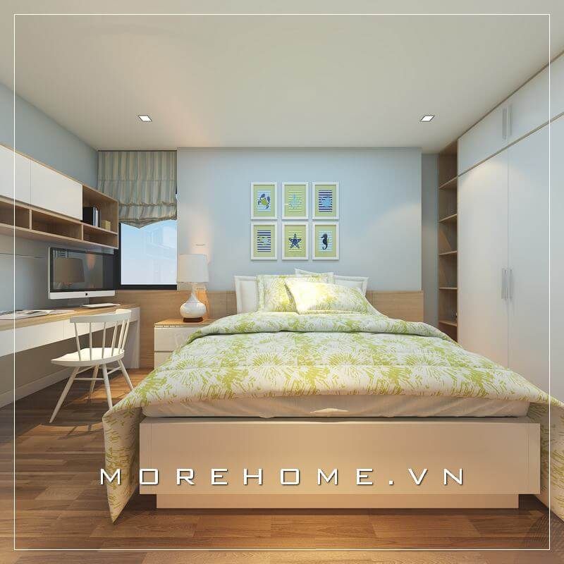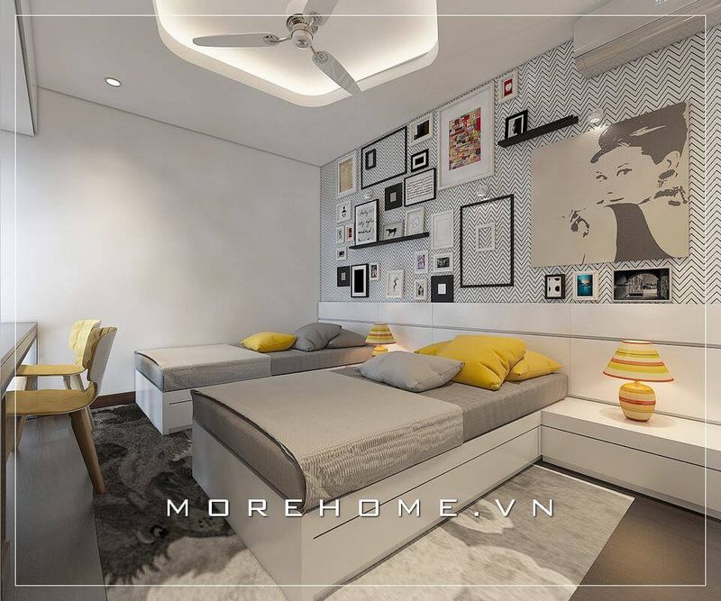 Mẫu giường ngủ gỗ công nghiệp hiện đại, gam màu trắng chủ đạo tạo cho phòng ngủ 2 bé trai thêm phần rộng thoáng hơn cả