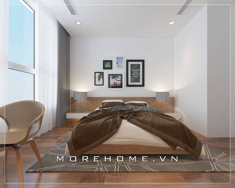 Giường ngủ chung cư hiện đại, đơn giản, gam màu vàng gỗ công nghiệp đầy tinh tế tạo cảm giác thoải mái và ấm áp hơn cho mỗi giấc ngủ của gia chủ