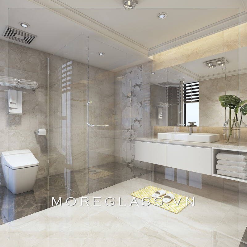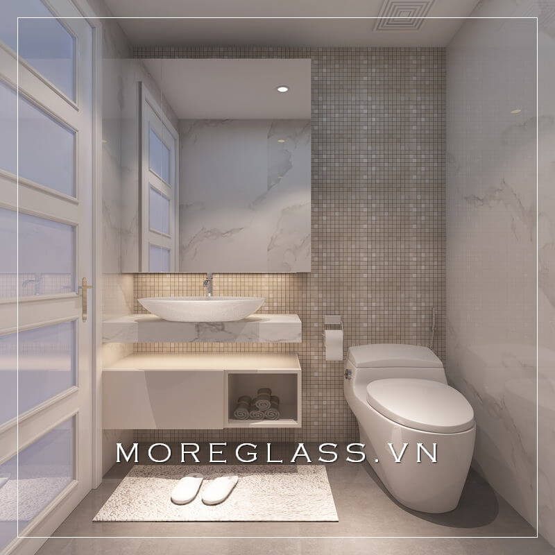 Mẫu thiết kế nhà vệ sinh hiện đại của chung cư đã kết hợp với phòng tắm kính cường lực cao cấp, giúp tạo ra không gian tiện nghi và thoải mái mà không bị chật trội.