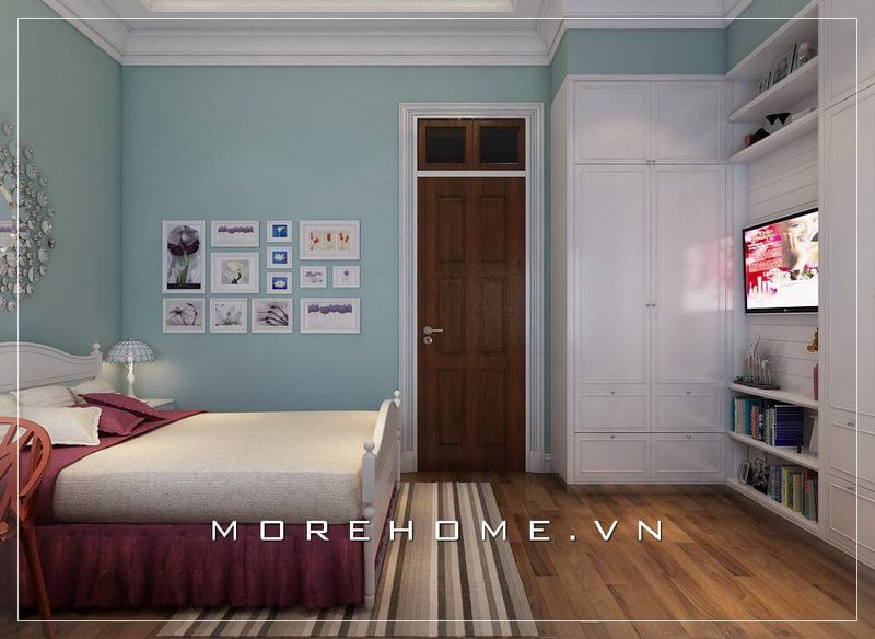 Nội thất phòng ngủ gỗ tự nhiên với màu trắng làm màu chủ đạo, kết hợp với sàn gỗ màu nâu tạo nên một hiệu ứng đầy ấn tượng, làm cho phòng ngủ trở nên sang trọng và rộng rãi hơn.