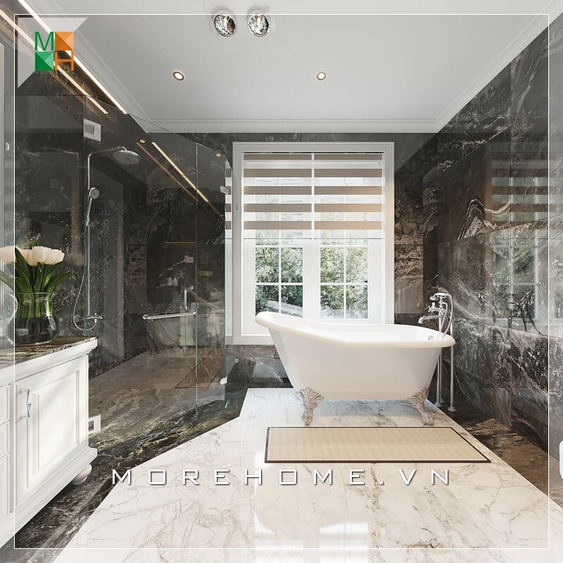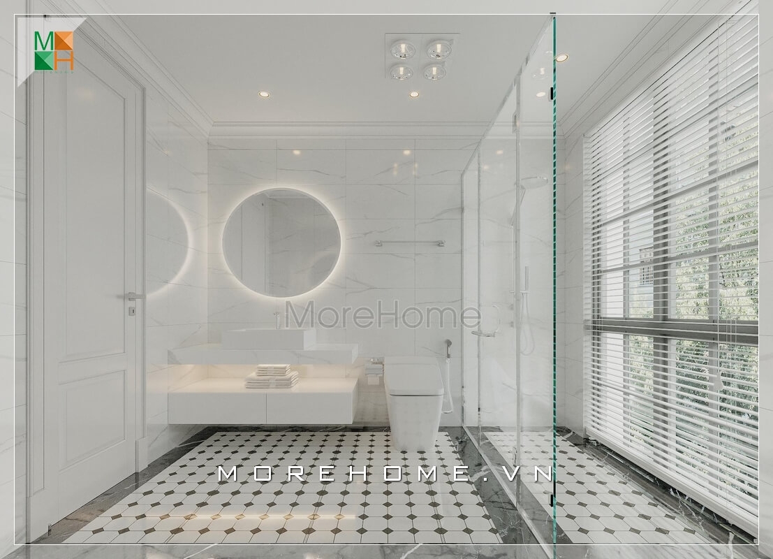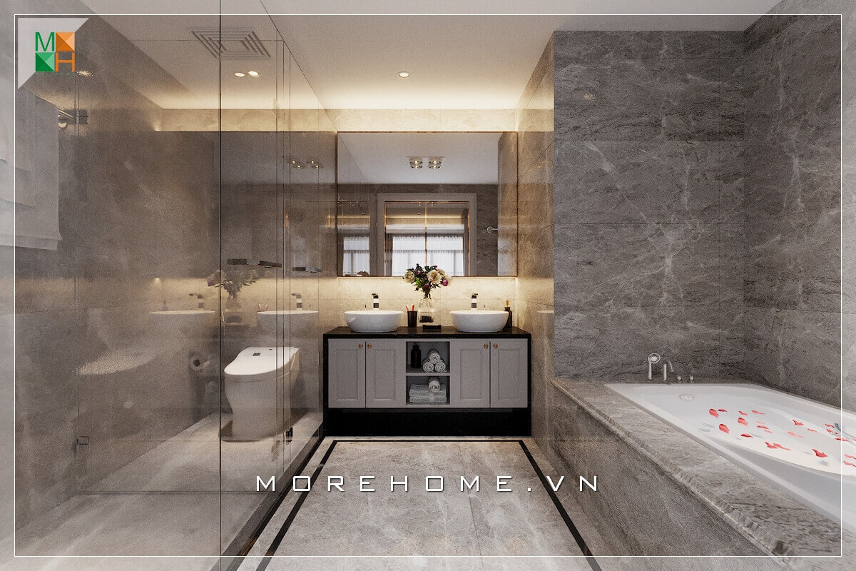 Phòng tắm được xem là một không gian quan trọng góp phần tạo nên tính thẩm mỹ cho nhà biệt thự cũng như tính thiết yếu của nó trong cuộc sống. Thả mình trong làn nước sau một ngày dài mệt mỏi còn gì tuyệt vời hơn. Chính vì vậy, đừng vì lý do gì mà không thiết kế một phòng tắm dành riêng cho bạn. Trong bài viết này là những mẫu thiết kế phòng tắm cho nhà biệt thự mà MoreHome tổng hợp, hãy cùng tham khảo nhé!