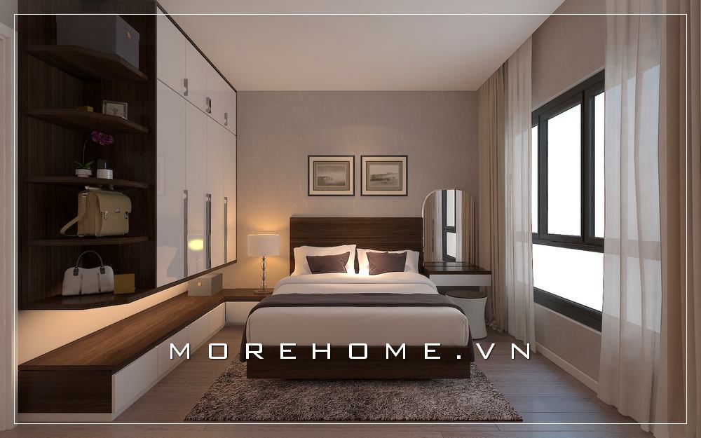 Mẫu giường ngủ chung cư gỗ công nghiệp với gam màu nâu trầm sang trọng, mang đến cảm giác ấm cúng cho cả căn phòng